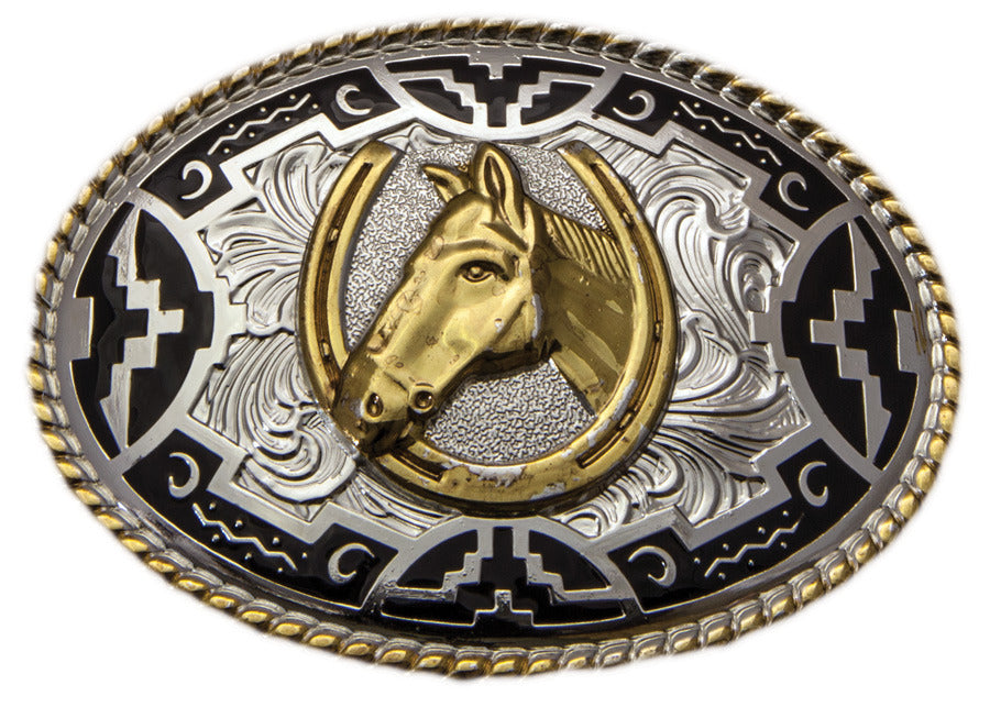 Aztec Horse Head Horse Shoe - Size 9cm x 6cm - Black Enamel inlay