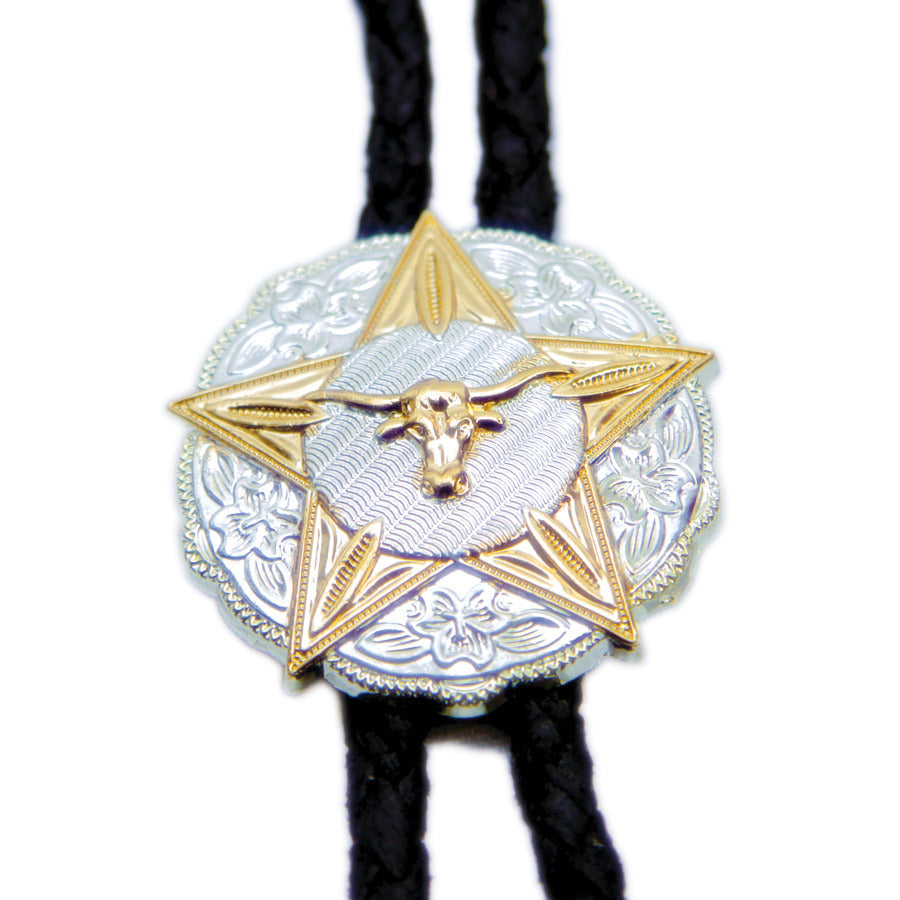 Brigalow Bolo # 5 "Steer Head Star" Features: - Silver Plate - Leather Cord - Silver and Gold Steer Head