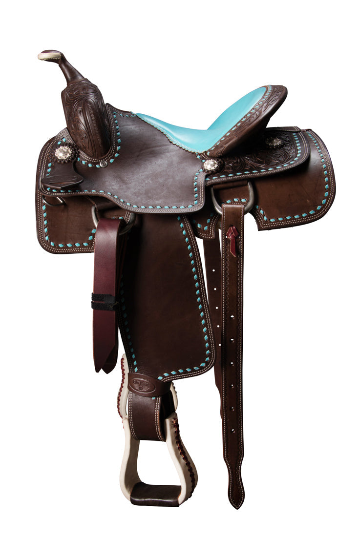 Discover the Fort Worth Barrel Racing Saddle with striking turquoise leather and eye-catching contrast buckstitch detail - engineered for performance and comfort. Featuring the advanced Opti-Flex Tree, this saddle’s fork and cantle are crafted from durable PPCP, while the bars and seat use a flexible polymer that moulds like arch support. This unique construction ensures a secure yet unrestricted fit, reducing pressure on both horse and rider for enhanced agility in the arena.