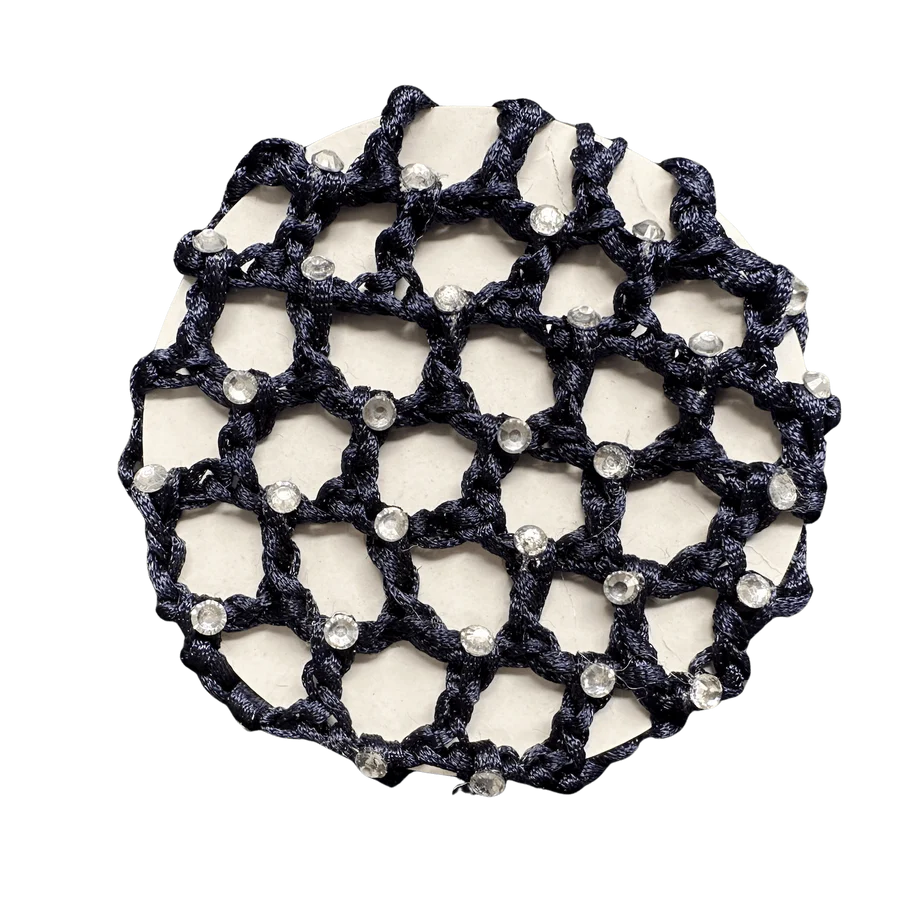 This sturdy, crocheted ribbon hair net adorned with sparkling diamantes is the ideal way to keep hair tidy, especially for horse riding, ballet, aerobics, wherever you are active.