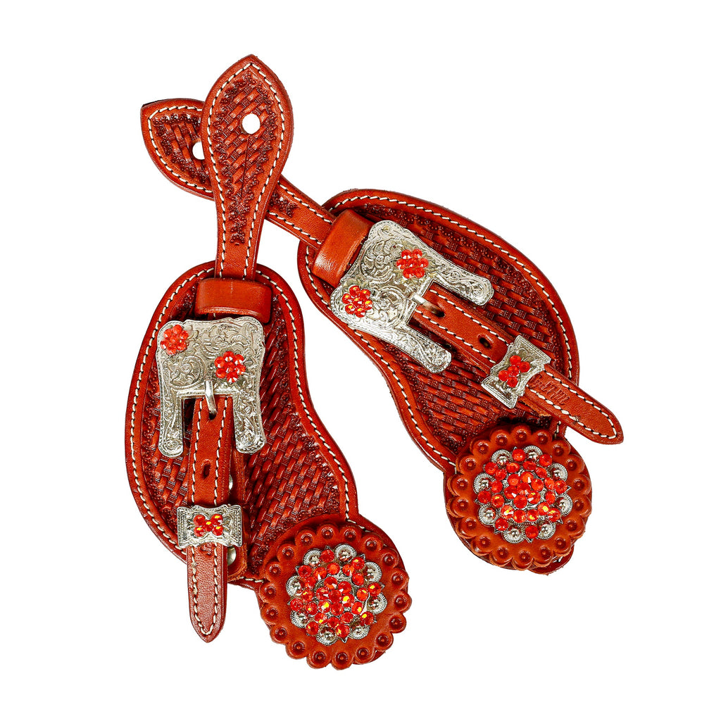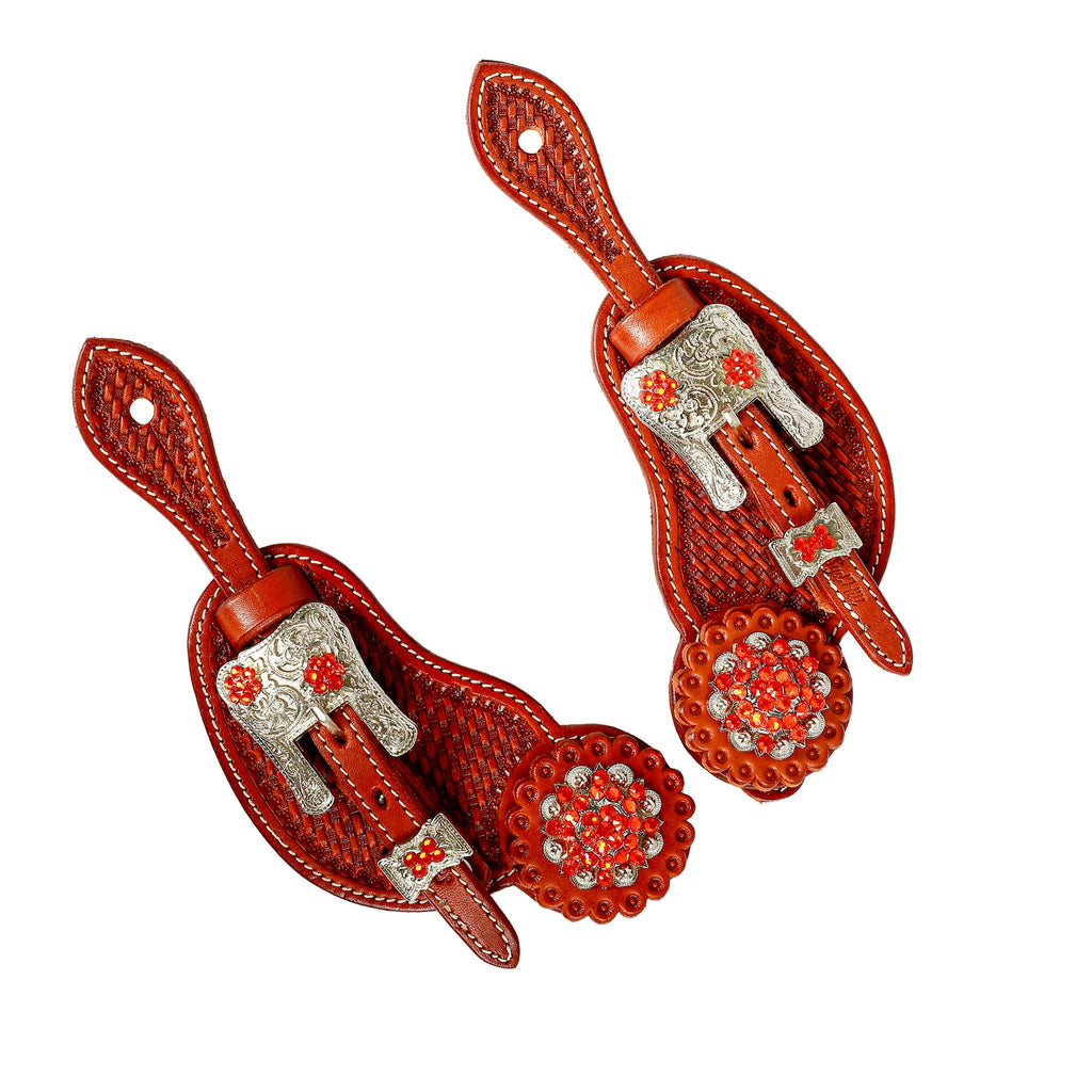 These Classic Spur Straps are expertly crafted from premium European leather and feature basket tooling, offering both durability and a refined, textured design. The circular conchos with orange crystals add a vibrant, eye-catching accent, enhancing the overall aesthetic.